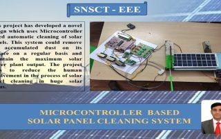 - Prawin Kumar S, Naveen K, Prakash R and Tinesh Kumar S of IV EEE collaborated together and developed a prototype for “Microcontroller based Solar Panel Cleaning system” with the guidance of Dr.R.Karthick, SNSCT during the time period from 12.07.2019 to 27.09.2019.